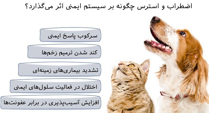 سیستم ایمنی شبکه‌ای پیچیده از سلول‌ها، بافت‌ها و اندام‌هاست که با هم کار می‌کنند تا از حیوان خانگی شما در برابر عوامل مهاجم مضر مانند باکتری‌ها، ویروس‌ها و انگل‌ها محافظت کنند. استرس و اضطراب می‌توانند تأثیر قابل‌توجهی بر سیستم ایمنی داشته باشند. وقتی بدن دچار استرس می‌شودچه حاد (کوتاه‌مدت) و چه مزمن (طولانی‌مدت)مجموعه‌ای از واکنش‌های فیزیولوژیک فعال می‌شود که می‌تواند عملکرد سیستم ایمنی را مختل و تضعیف کند.