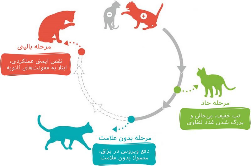 2. مرحله بدون علامت (مرحله نهفته): پس از بهبود از اولین علائم، گربهها معمولاً یک دوره چند ماه تا چند ساله را پشت سر میگذارند که در آن ظاهراً سالم به نظر میرسند، اما سیستم ایمنی آنها به تدریج تضعیف میشود. در این دوره، ویروس با سرعت بسیار کم در سلولهای سیستم ایمنی تکثیر میشود.