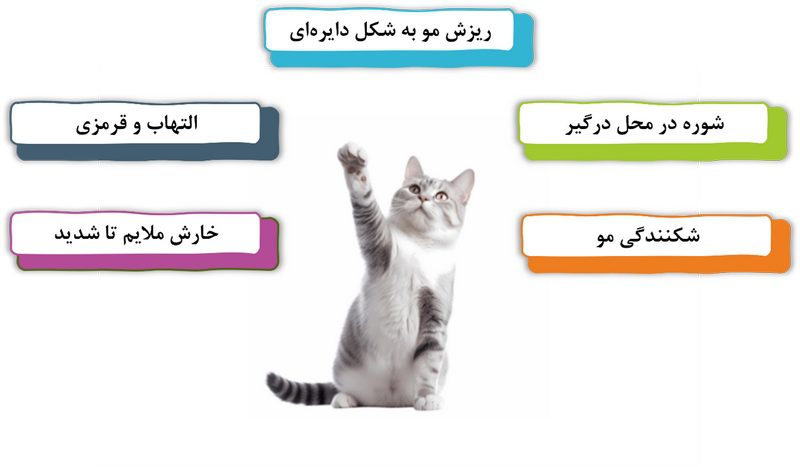 درماتوفیتوزیس شایعترین عفونت قارچی پوستی در گربهها است. این نوع عفونت قارچی معمولاً با نام کرم حلقوی یا Ringworm شناخته میشود. برخلاف نامش، کرم حلقوی توسط کرم ایجاد نمیشود، بلکه عامل آن نوعی قارچ است. ضایعه کلاسیک کرم حلقوی شامل ناحیهای دایرهای از ریزش مو و پوستهریزی است که بهتدریج گسترش مییابد. برخی گربهها ممکن است دچار کرم حلقوی باشند بدون اینکه علائم واضح پوستی داشته باشند، یا ممکن است الگوهای متفاوتی از ریزش مو و پوستهریزی نشان دهند.