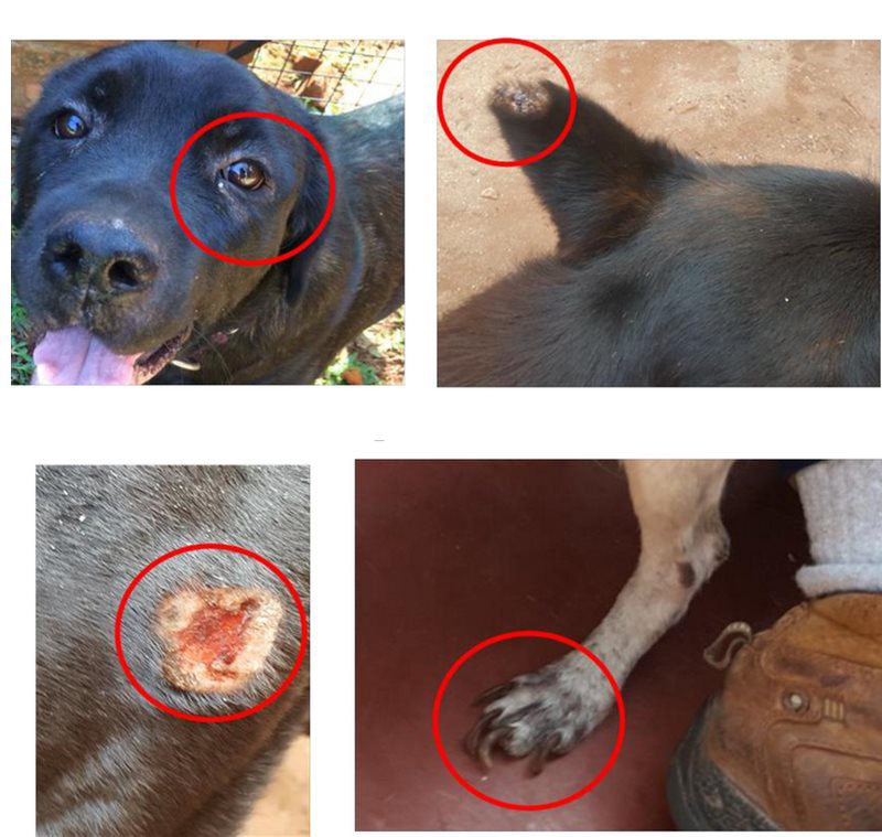 - علائم لیشمانیوز جلدی: شایعترین علائم شامل ضخیم شدن و سخت شدن بافتها در بینی و پنجهها است. بسیاری از سگها با پیشرفت بیماری، رنگدانه یا رنگ تیره این نواحی را از دست میدهند. ممکن است گرهها یا تودههای سخت در پوست ایجاد شود و پوشش مو اغلب کدر و شکننده به همراه نواحی ریزش مو دیده میشود. ناخنها ممکن است بلند شده و به طور غیرطبیعی خم شوند.