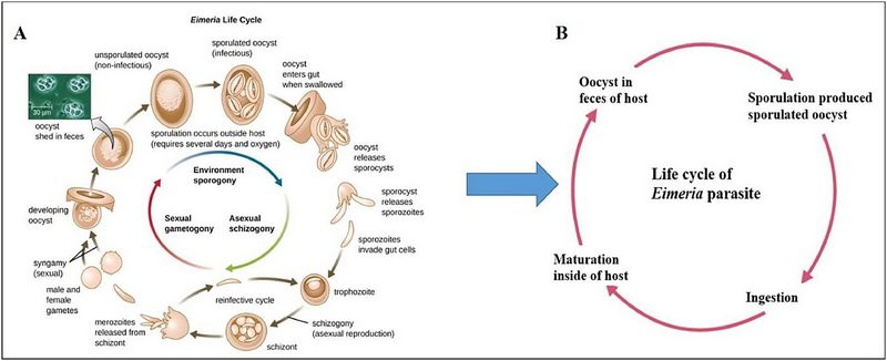 کوکسیدیوز یک بیماری انگلی در طیور است که توسط تکیاختههای گونههای مختلف Eimeria ایجاد میشود و بهویژه دستگاه گوارش را هدف قرار میدهد. این انگلیها چرخهٔ زندگی پیچیدهای دارند که شامل مراحل درونسلولی و برونسلولی است. ابتدا اووسیستهای اسپوردار از طریق دهان وارد بدن میشوند، سپس اسپوروئیتها از اووسیست آزاد شده و به سلولهای اپیتلیال روده حمله میکنند. درون این سلولها، انگل مراحل تکثیر شیزوگونی (schizogony) و سپس گامتوگونی (gametogony) را طی میکند. در نهایت اووسیستهای جدید تشکیل و با مدفوع دفع میشوند که این چرخه باعث بروز علائم بالینی میگردد.