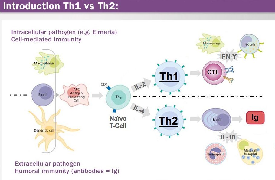 یکی از مهمترین مولکولهای سیتوکینی که در ایمنی علیه Eimeria فعال میشود، اینترفرون-گاما (IFN-γ) است. IFN-γ عمدتاً توسط تیسلهای Th1 و برخی سلولهای CD8+ تولید میشود و این سیتوکین بهطور مستقیم در مهار تکثیر درونسلولی Eimeria نقش دارد و موجب افزایش فعالیت سلولهای کشنده و تنظیم پاسخ ایمنی میشود. مطالعات نشان دادهاند که افزایش IFN-γ در محل عفونت باعث کاهش تعداد اووسیستها و بهبود وضعیت روده میشود. این مکانیسم نشان میدهد که IFN-γ نه تنها پاسخ سلولی را هدایت میکند، بلکه بهصورت مستقیم تأثیر ضدانگلی نیز دارد.