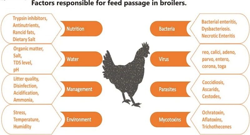 عوامل متعددی در بروز و شدت کوکسیدیوز نقش دارند که شامل تراکم بالای گله، مدیریت بهداشتی نامطلوب، استرس‌های محیطی و خوراک نامناسب می‌شود. در پرورش طیور گوشتی که در مقیاس‌های بزرگ انجام می‌گیرد، این عوامل زمینه‌ای می‌توانند به‌طور همزمان عمل کنند و احتمال عفونت و شیوع کوکسیدیوز در گله را افزایش دهند. هنگامی که کوکسیدیوز در گله شیوع پیدا می‌کند، تغییراتی در ساختار و عملکرد روده رخ می‌دهد که به‌طور مستقیم بر کارایی خوراک تأثیر می‌گذارد و می‌تواند منجر به وضعیتی شود که به نام سندروم رد دان (Feed Passage Syndrome) شناخته می‌شود.
